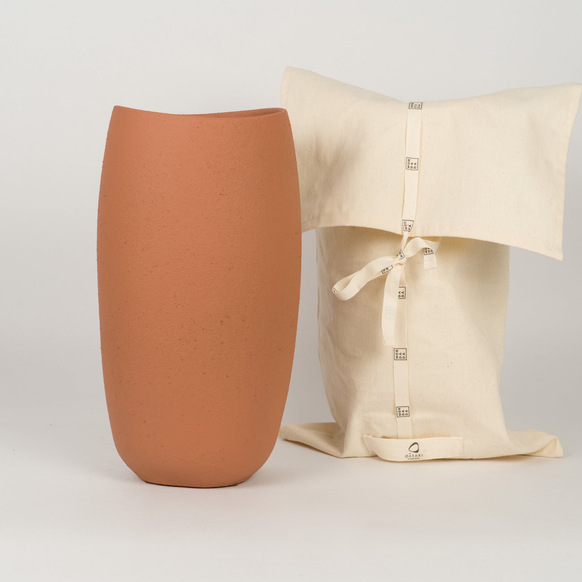Onze Doteki-vaas wordt zorgvuldig verpakt in een linnen envelop in een luxe geschenkdoos, waardoor een verfijnde presentatie wordt gecombineerd met ingetogen elegantie.