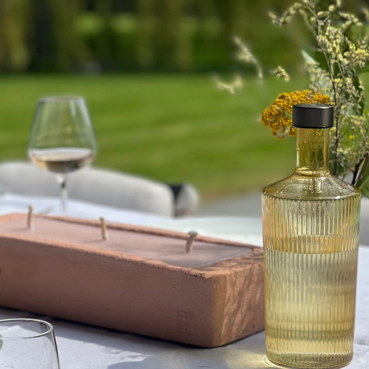 De was die gebruikt wordt voor onze buitenkaarsen is een minerale was met een smeltweerstand van 60 graden Celsius. Onze buitenkaarsen smelten niet weg in de zon!
