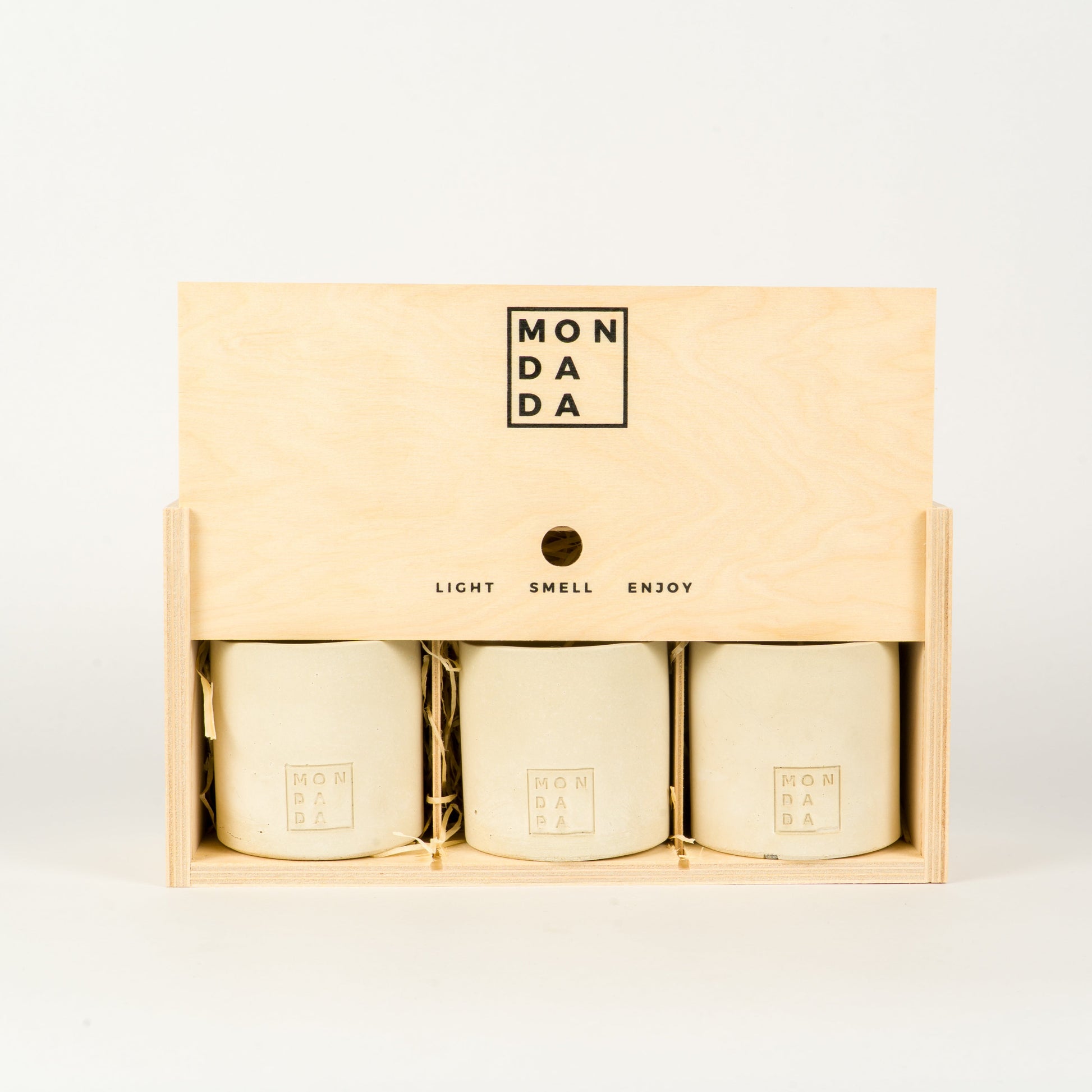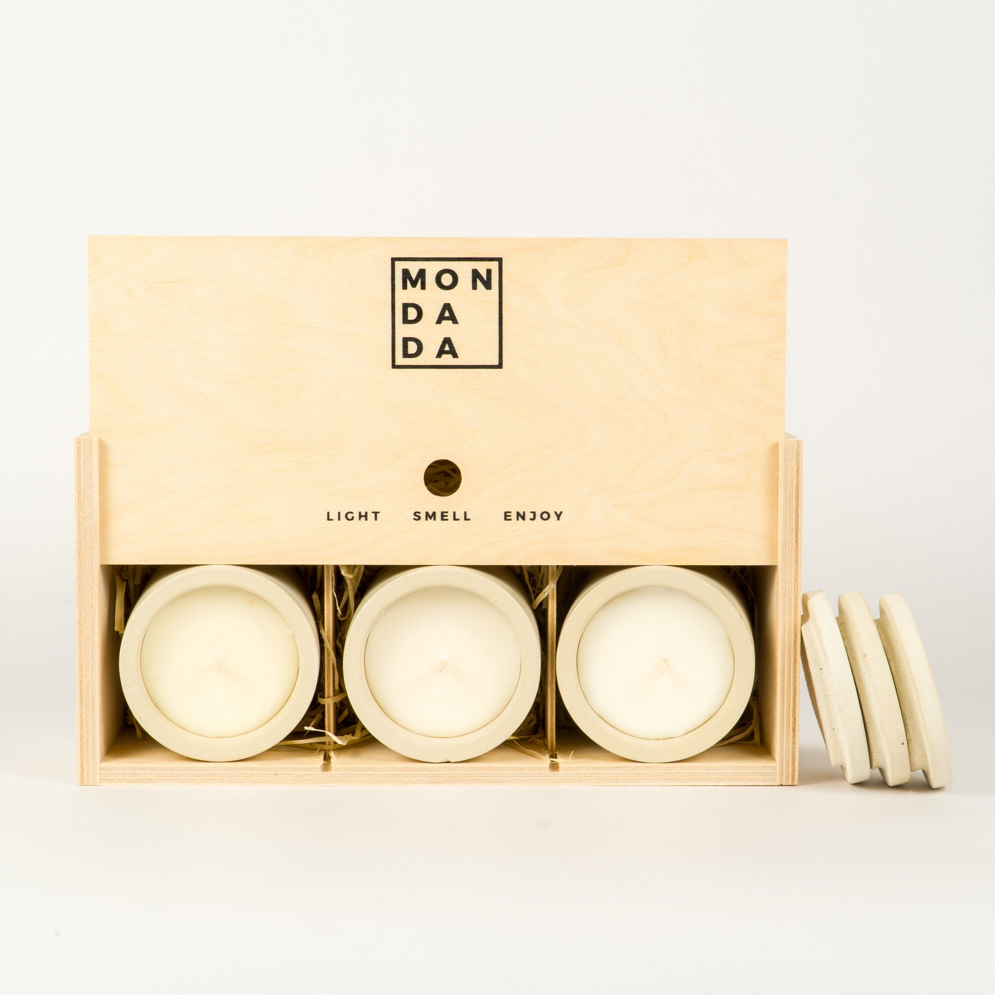Set of three iconic concrete mini candles with lids. All our indoor concrete candles come in a luxury wooden giftbox.